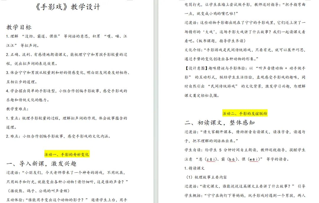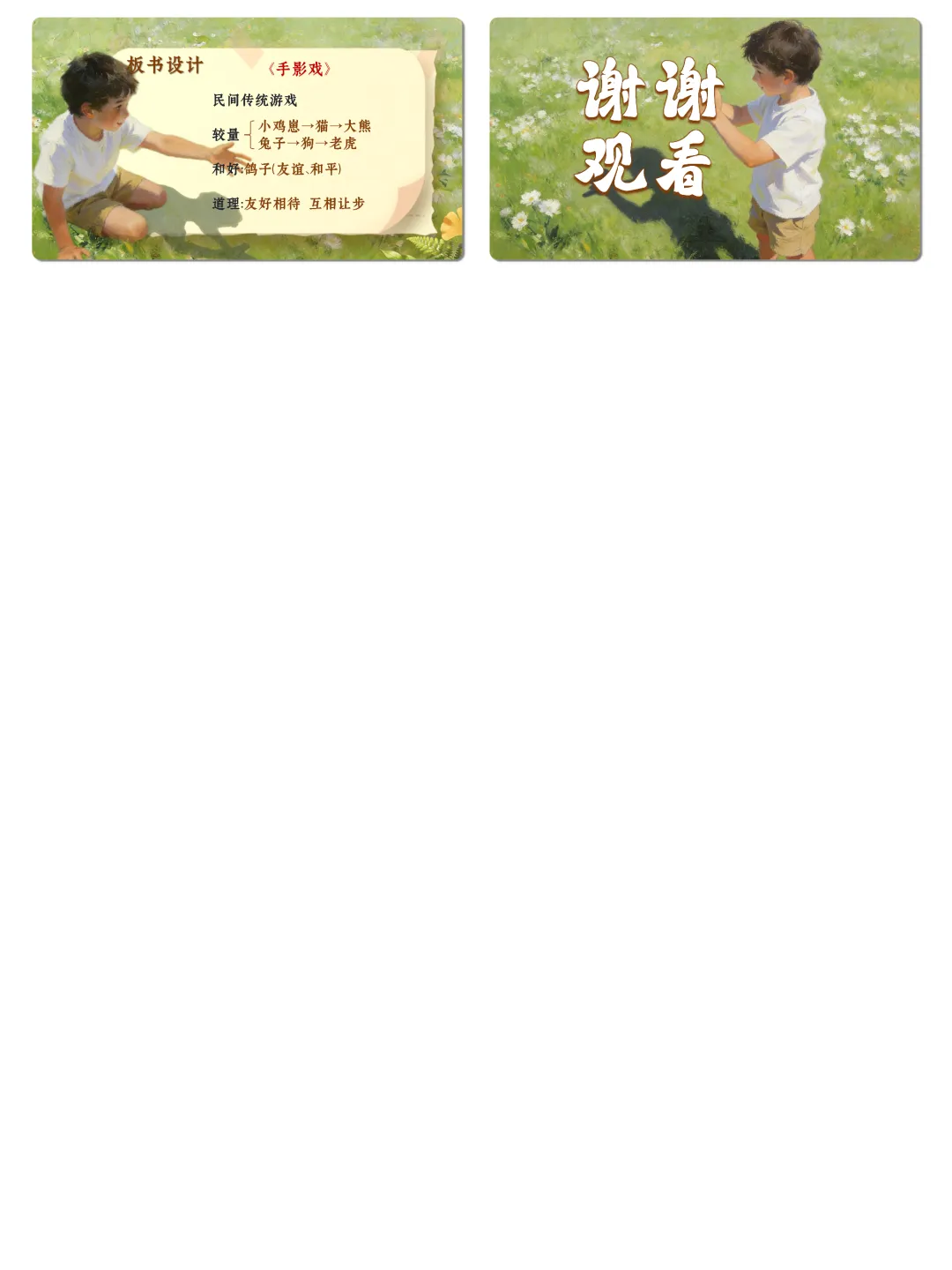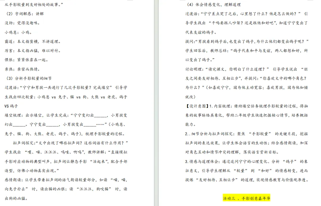 文化介绍:“手影游戏是民间传统游戏,只要有光,就可以展开巧思,通过手势的变化创造出各种动物的形象。”