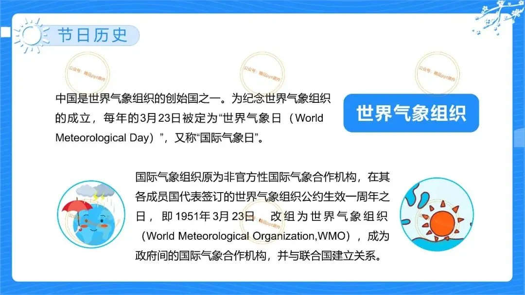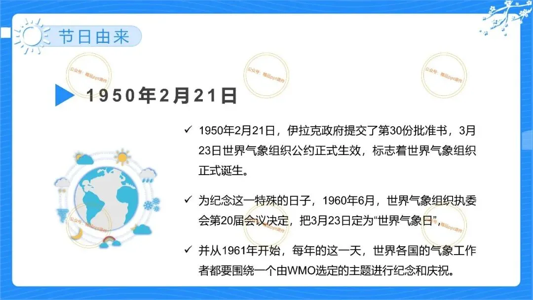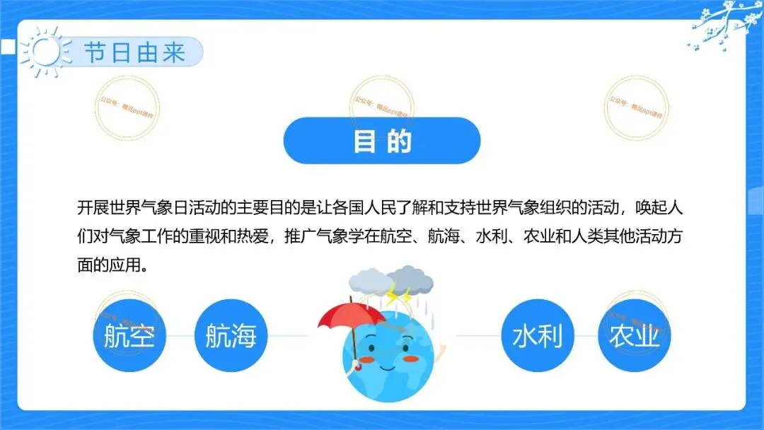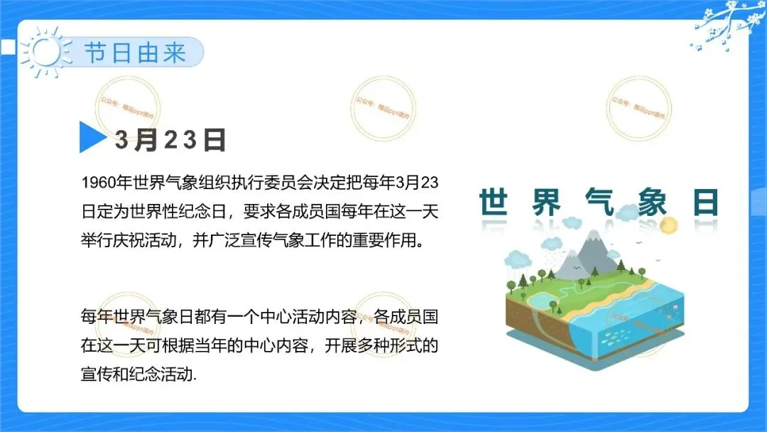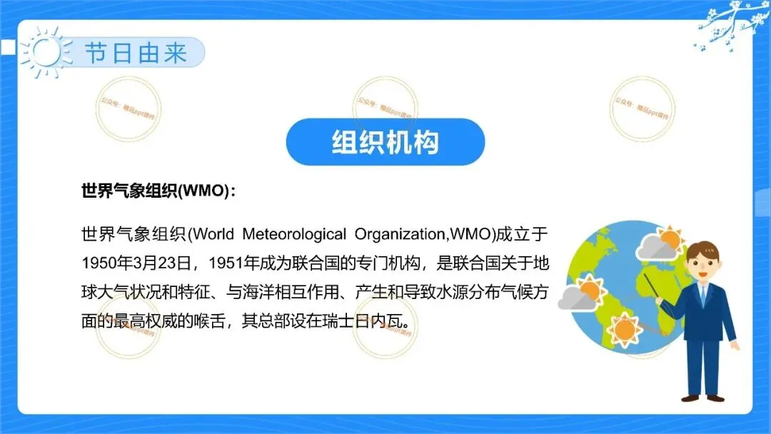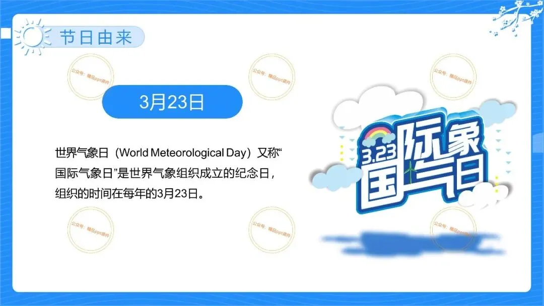 2、本公众号成立的初衷是为广大ppt使用者提升工作效率,所发布的课件资源仅供学习交流禁止用于商业用途,有偿所得用来维系公众号运营所支出的人工成本,性质为买家友情赞助后获取的信息差而非售卖资源的费用。同意此声明后即可下载本期2026世界气象日ppt幼儿园主题活动宣传课件。如有侵犯您的权利,请联系小沐老师。