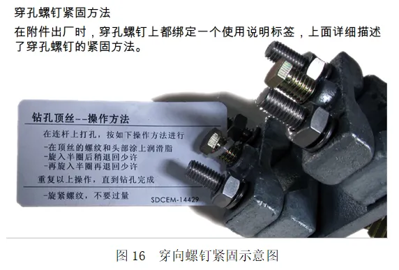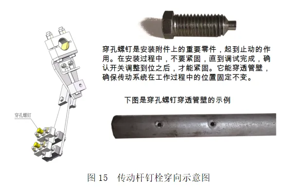 ⑭如果需要大幅调整传动杆行程,在调整完成后,传动杆的穿孔螺钉要穿透传动杆外壁;如图15、图16