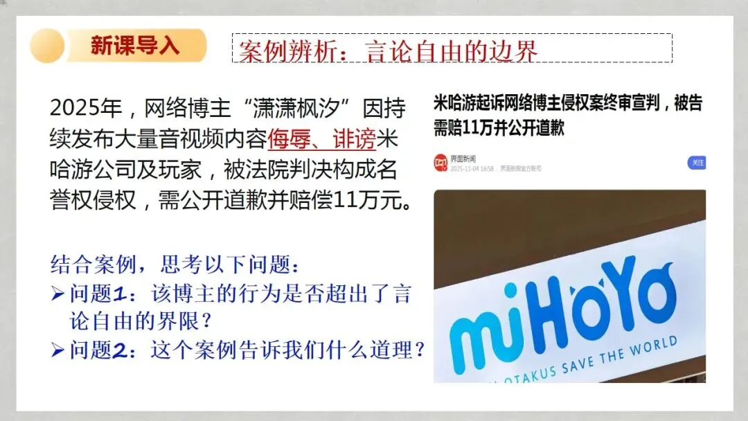 1.多媒体展示案例:2025年网络博主“潇潇枫汐”长期发布侮辱、诽谤言论,侵害米哈游公司及玩家名誉权,被法院判决公开道歉并赔偿11万元。