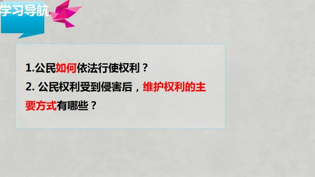 2.讲解核心观点:公民权利受到侵害,要依照法定程序维护权利。