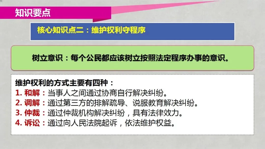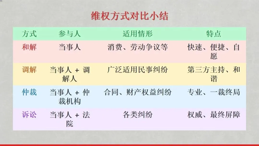 2.维护权利守程序——掌握和解、调解、仲裁、诉讼四种维权方式,树立程序意识。