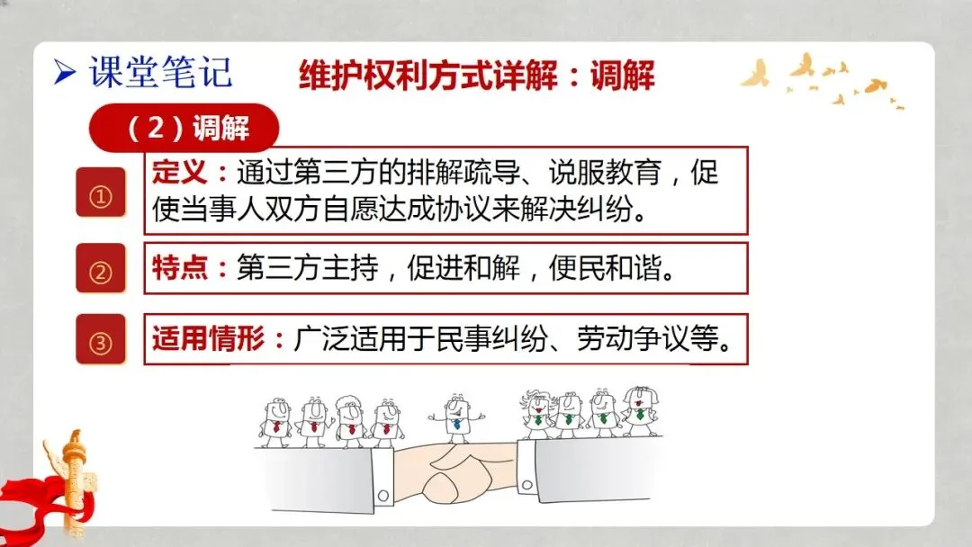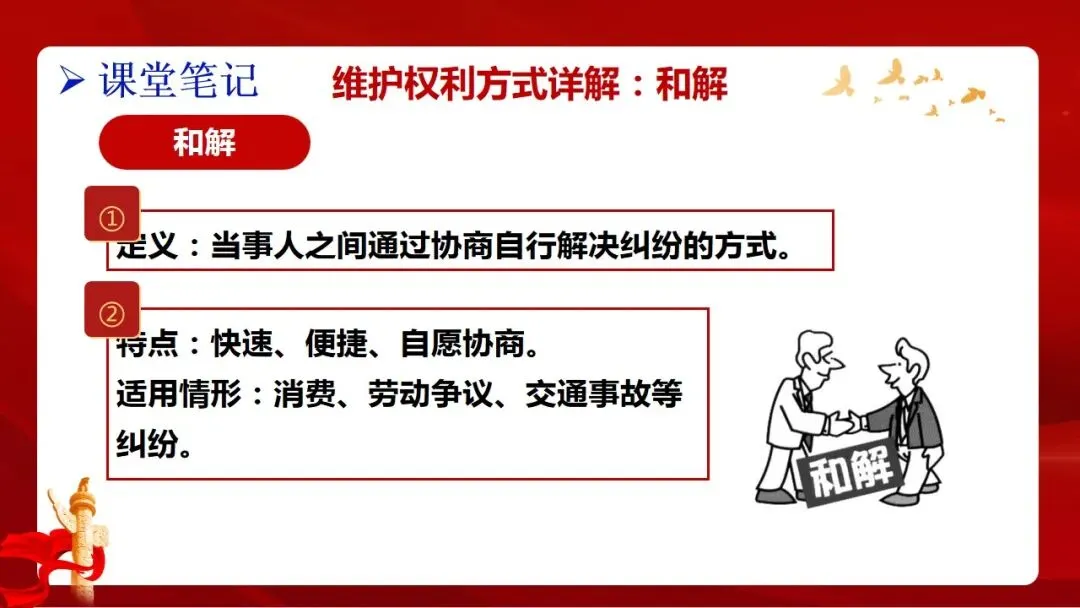 2.公民意识:准确掌握和解、调解、仲裁、诉讼四种维权方式的含义、特点、适用范围,能区分不同维权途径。