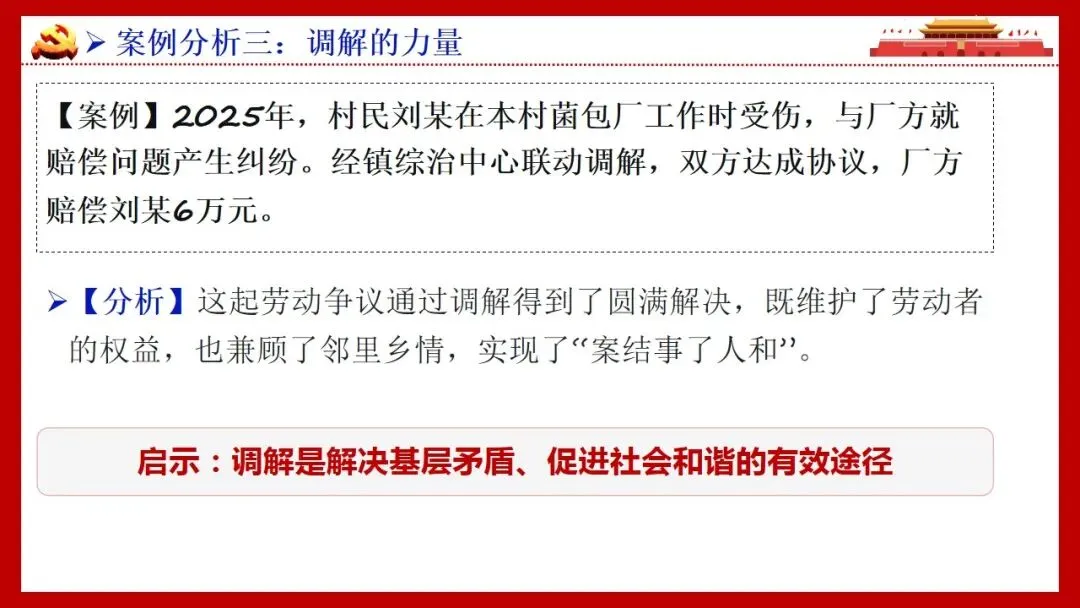 2.展示案例:村民工伤赔偿纠纷,经镇综治中心调解成功获赔6万元。