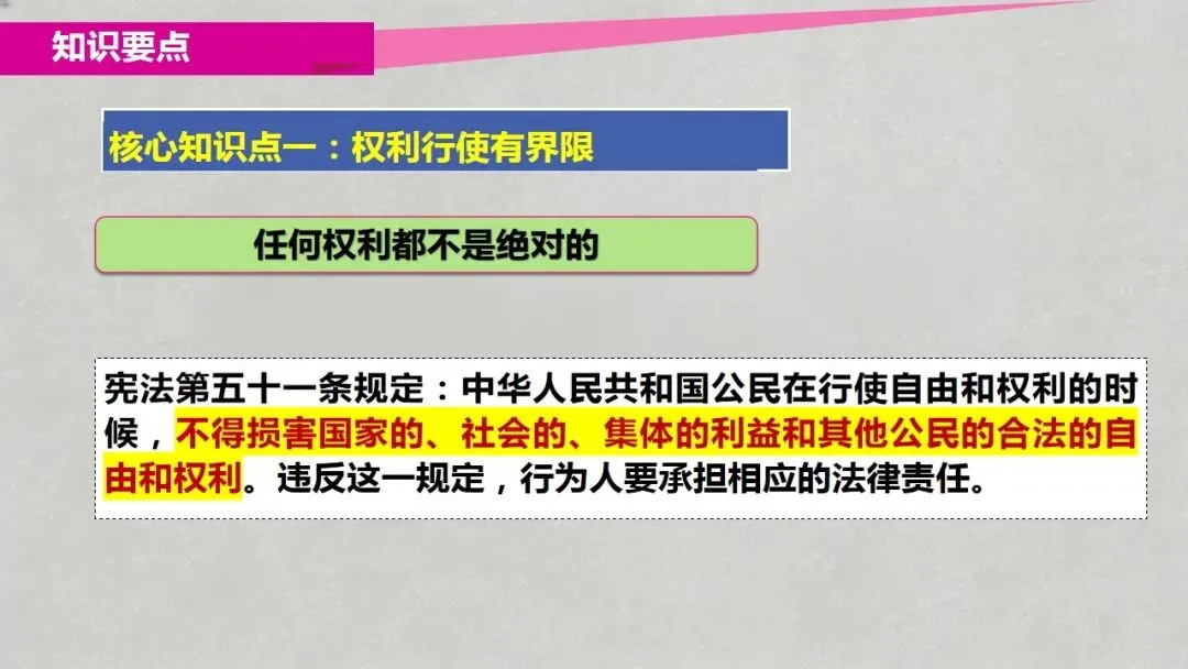 1.权利行使有界限——明确权利不是绝对的,行使权利不得损害国家、社会、集体和他人合法权益。