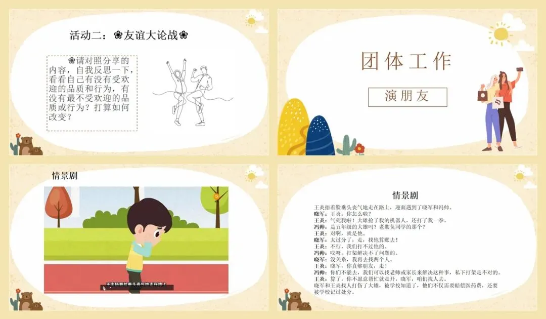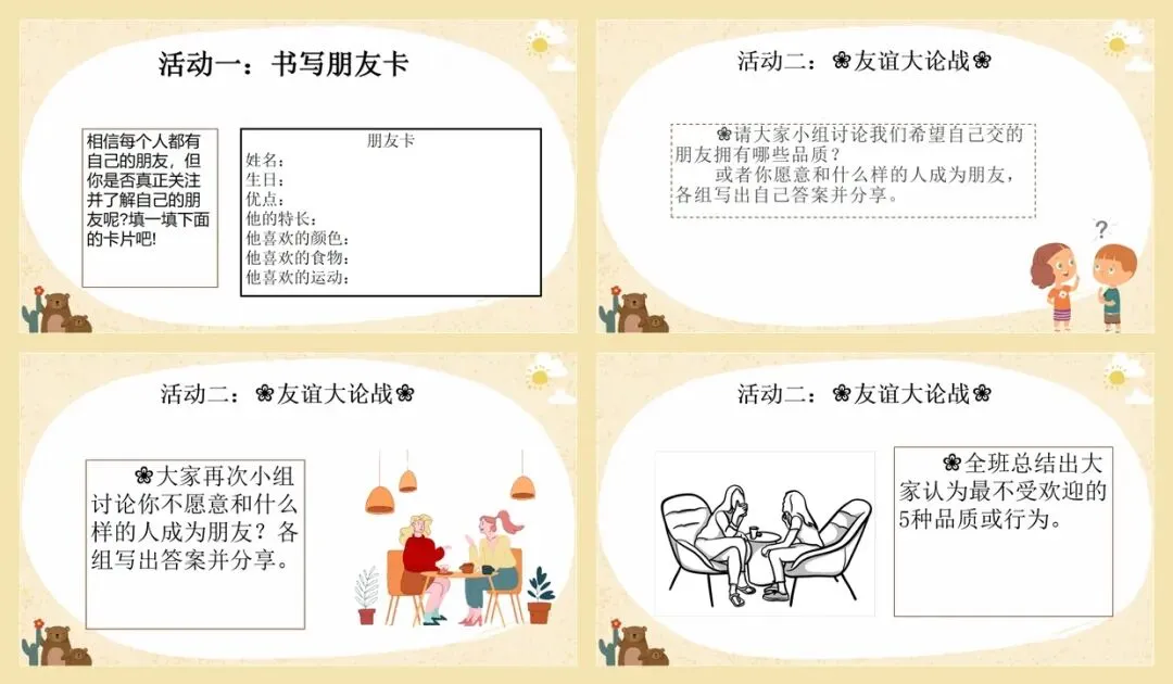 四年级学生开始产生独立意识,渴望在交友过程中获得更多的自主权和选择权。他们可能会尝试自己解决与朋友的矛盾和问题,而不总是依赖家长或教师的帮助。因此在教学过程中,加入了一些游戏环节,通过书写朋友卡,以及对于情景剧的演绎,让学生充分认识什么样的朋友才是真正的好朋友,拥有友谊会给自己带来快乐。