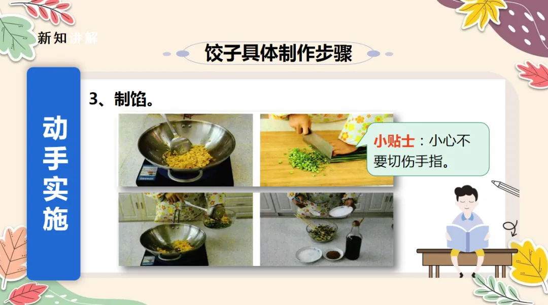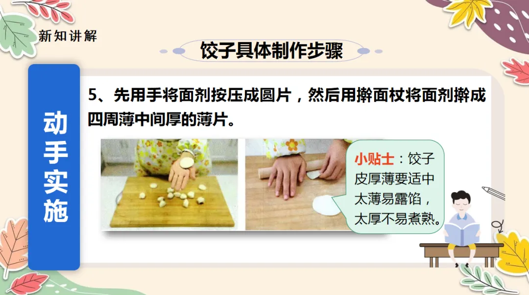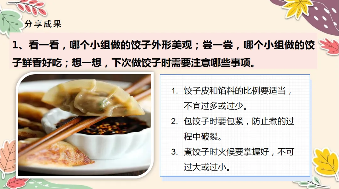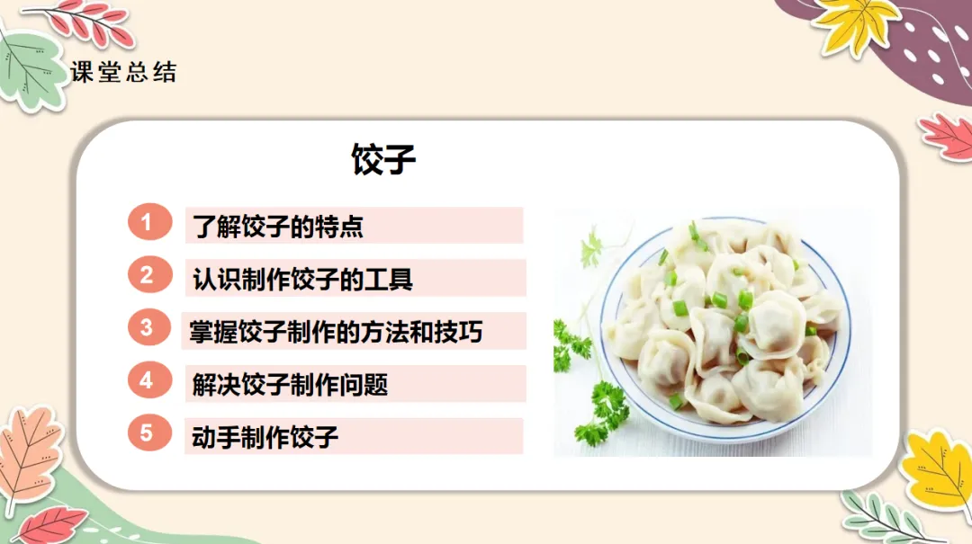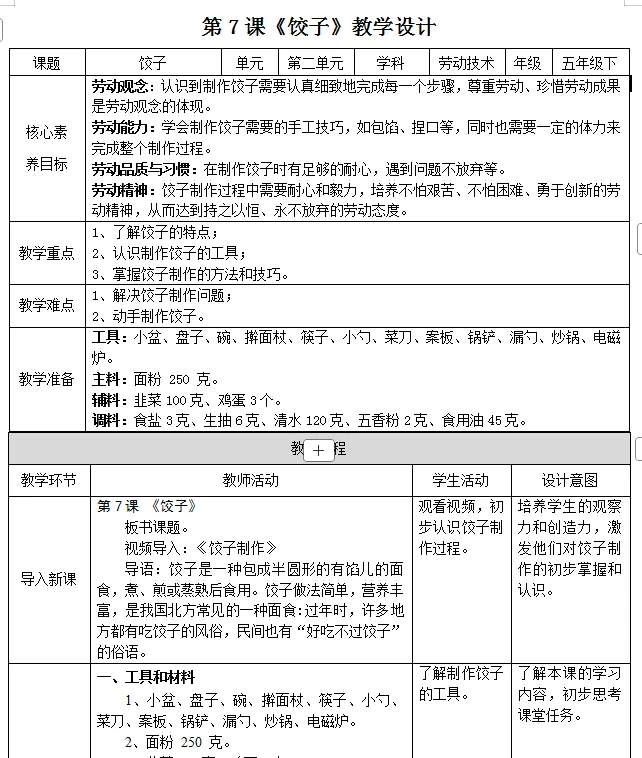 劳动观念:认识到制作饺子需要认真细致地完成每一个步骤,尊重劳动、珍惜劳动成果是劳动观念的体现。