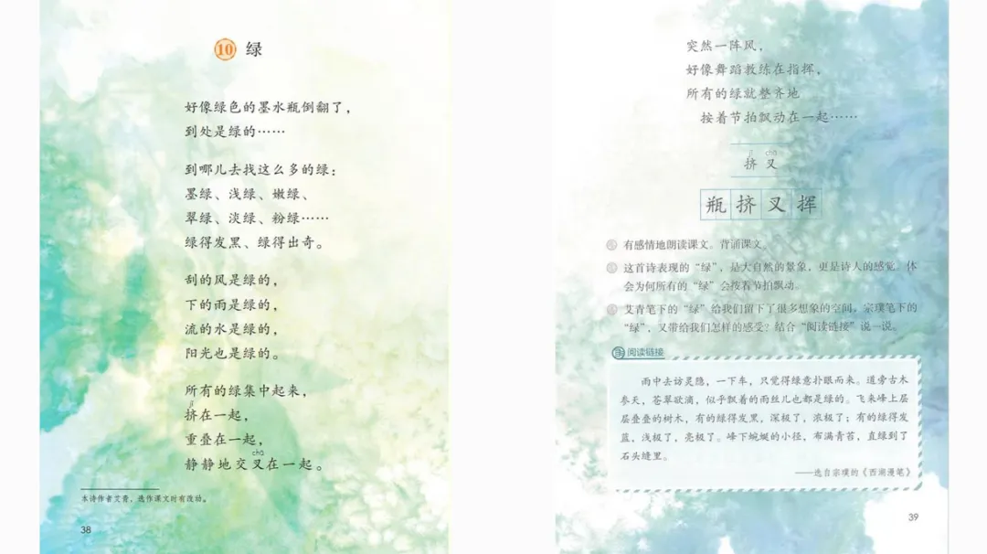 师:嗯,我觉得你们说的都很正确,所以这里的省略号里藏着很多很多的绿,还有很多的绿,是不是?同学们,你还知道什么绿呢?你说。