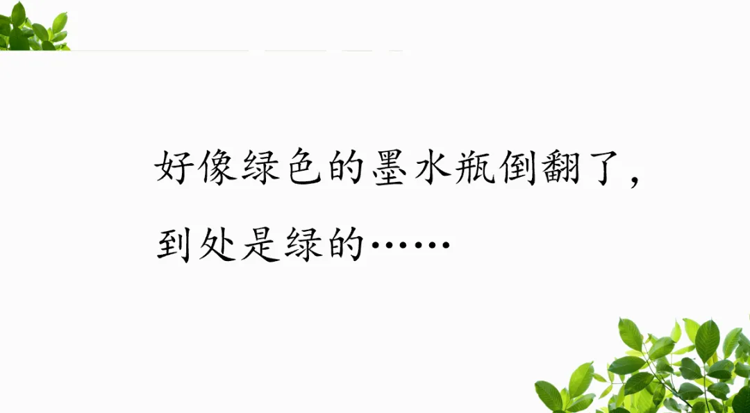 师:同学们说的真好,草是绿的,树是绿的,山是绿的,水也是绿的,物之所及,哪里都是绿的。难怪诗人这里用了一个省略号,就是要我们去展开想象,要读出想出到处是绿的感受,我们一起来读一读,好像绿色的墨水瓶倒翻了一二