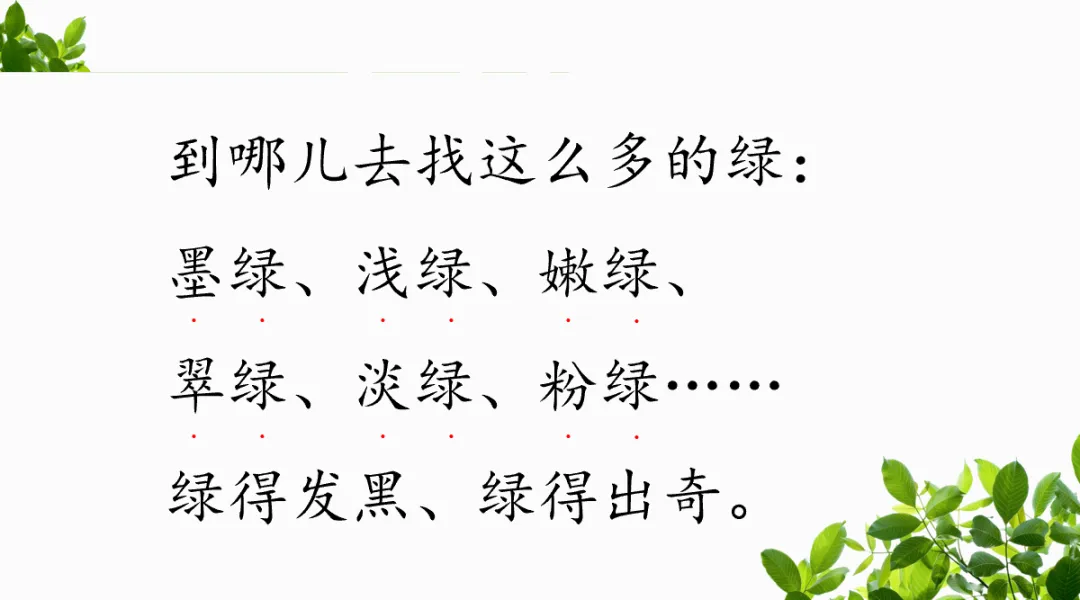 生:他找到了墨绿、浅绿、嫩绿、翠绿、淡绿、粉绿。