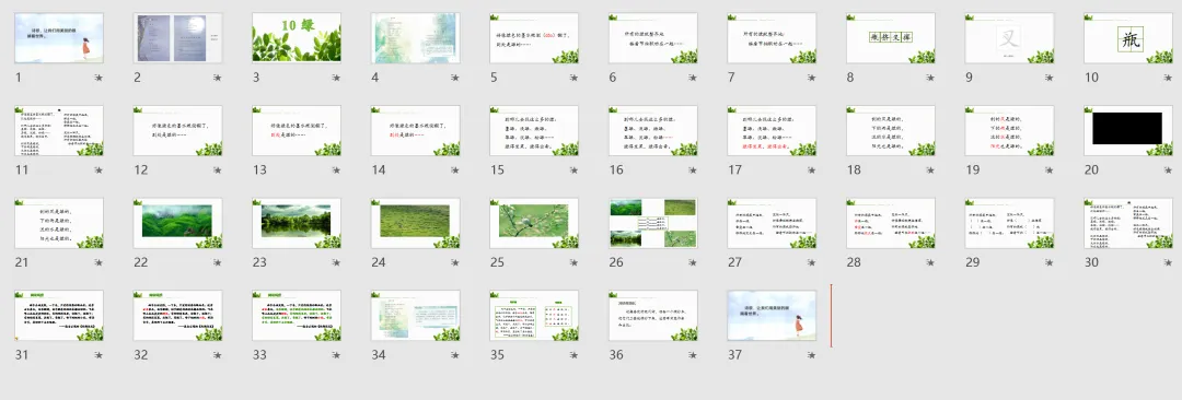 师:读的真好,听了你们的朗读,殷老师的眼前仿佛出现了一个巨大的墨水瓶,翻了,那绿就咕咚咕咚争先恐后地流淌出来,眼前的世界全都被染绿了,一大片一大片的绿,深深浅浓浓淡淡的绿,太好看了。所以诗人接着写道,到哪儿去找这么多的绿?墨绿、浅绿、嫩绿、倍绿、淡绿、粉绿、绿的、发黑绿的出奇,是要在寻找他找到了哪些绿。然后他找到了墨绿、浅绿、嫩绿、翠绿、淡绿、稳绿。还有谁来说陈书涵?