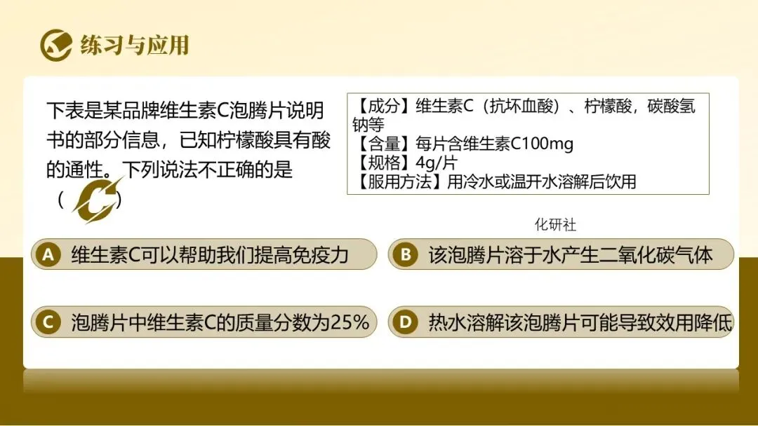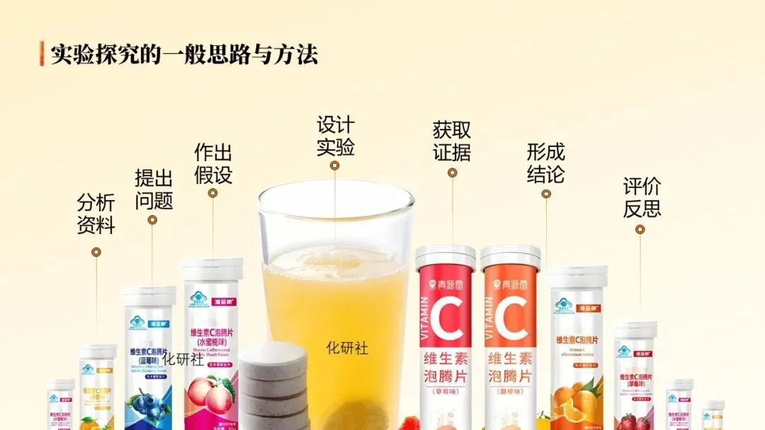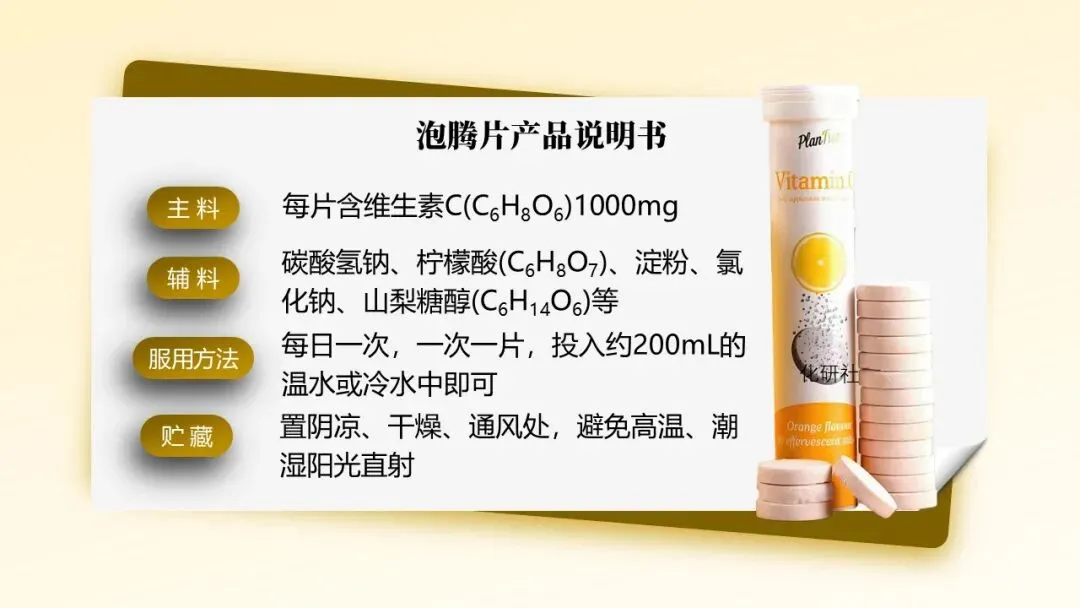 - 发放泡腾片产品说明书,引导学生快速提取核心成分:维生素 C、碳酸氢钠、柠檬酸、淀粉等。