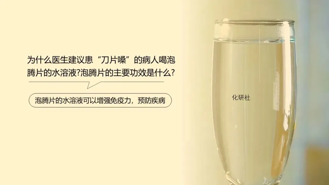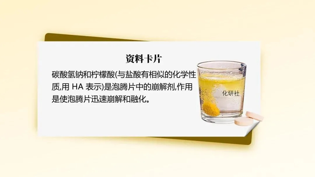 - 补充生活情境:“感冒时医生建议喝泡腾片水溶液,它能补充维生素 C,同时产生的气泡让饮用更愉悦。结合生活经验,你觉得泡腾片的成分可能有哪些?”