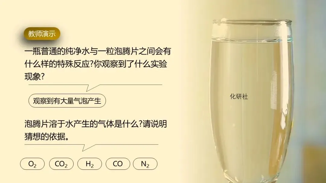 - 教师演示:取一粒泡腾片投入盛有蒸馏水的烧杯中,引导学生观察 “大量气泡快速产生” 的宏观现象;播放 “天宫课堂” 中泡腾片与水球相遇的实验视频,提问:“太空中的泡腾片为何也能产生气泡?这些气泡是什么?泡腾片里藏着怎样的化学秘密?”