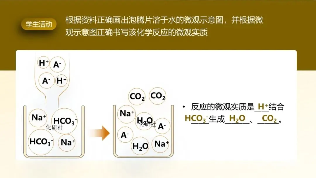 3.结论提炼:各小组发言人汇报实验结果,教师总结:“泡腾片遇水产生的气体为 CO₂,这是碳酸氢钠与柠檬酸反应的产物。”