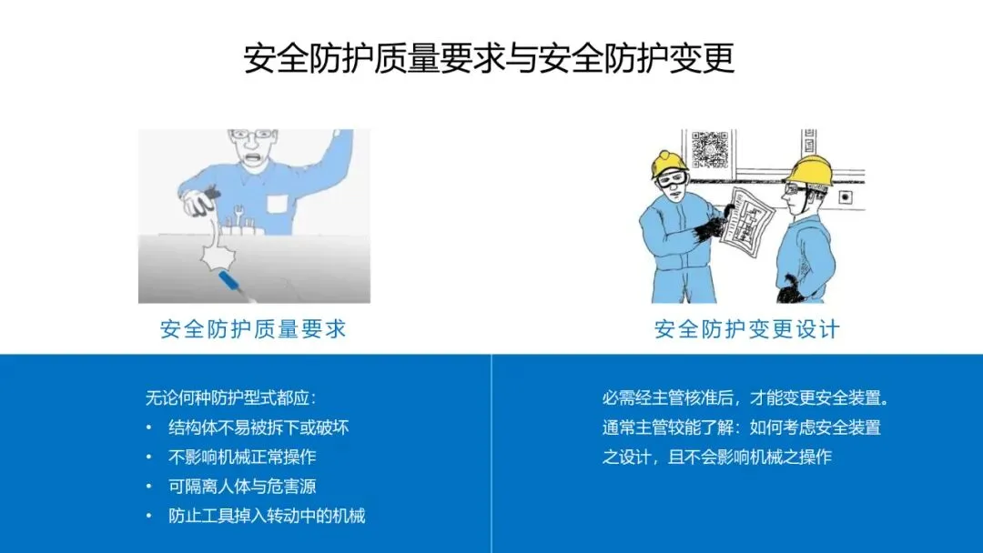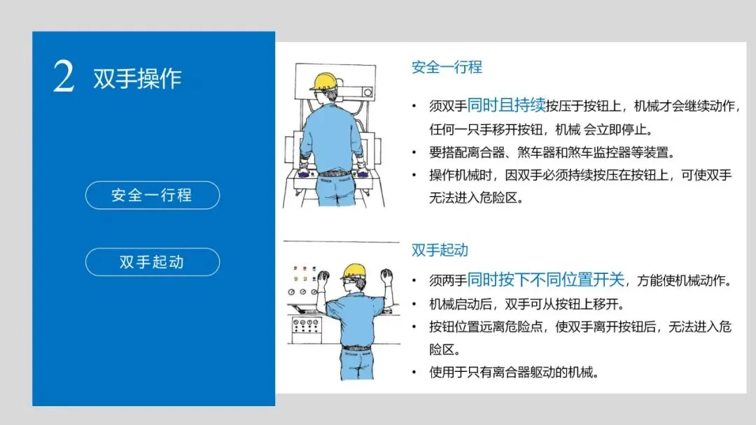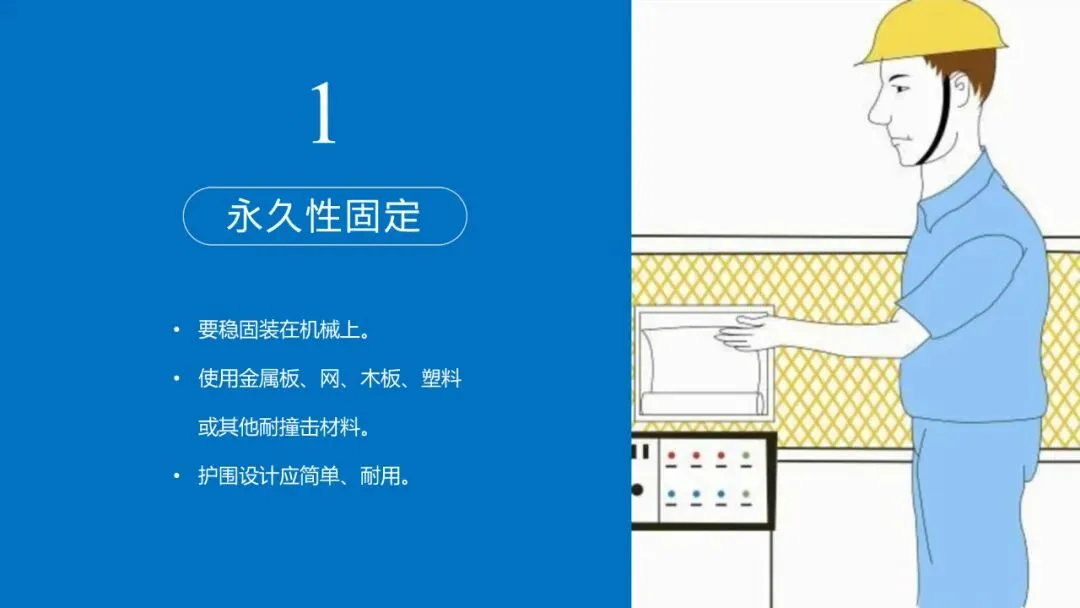 物理防护是阻断伤害的重要屏障。针对不同设备类型加装适配的防护装置,如冲压机安装双手启动装置、车床设置卡盘保险、输送设备加装防护网;定期检查防护设施状态,发现破损、松动立即停用维修,严禁为追求效率擅自拆除防护装置;在设备危险区域张贴醒目的警示标识,如 “禁止靠近”“当心卷入” 等,提醒人员注意风险。
