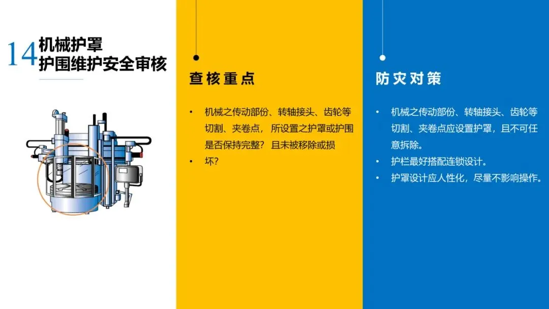 险之一,其涵盖挤压、剪切、卷入、撞击等多种类型,防范需聚焦设备全生命周期与人员操作全流程,核心重点可归纳为以下五方面: