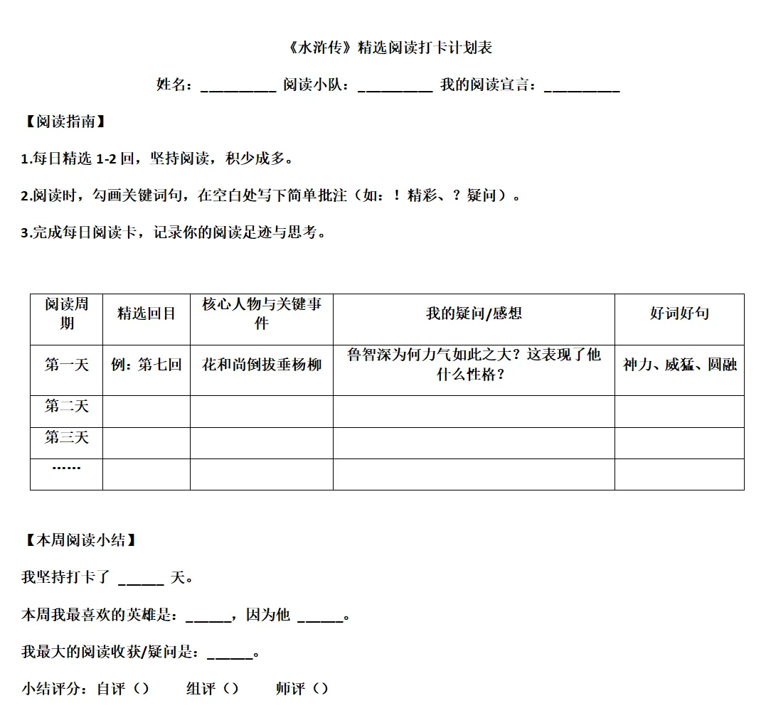 1.学生制定个人或小组阅读计划表,明确精选阅读进度(如每日一回)。