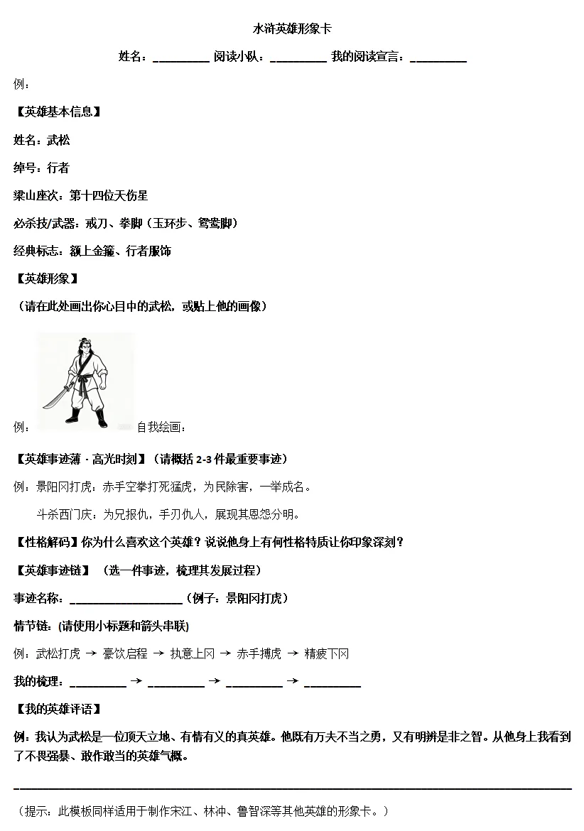 学生阅读《景阳冈》后,为武松制作形象卡;或选择其他感兴趣的水浒英雄(如宋江、林冲、鲁智深等)进行制作,将信息与思考填写在下方的模板中。