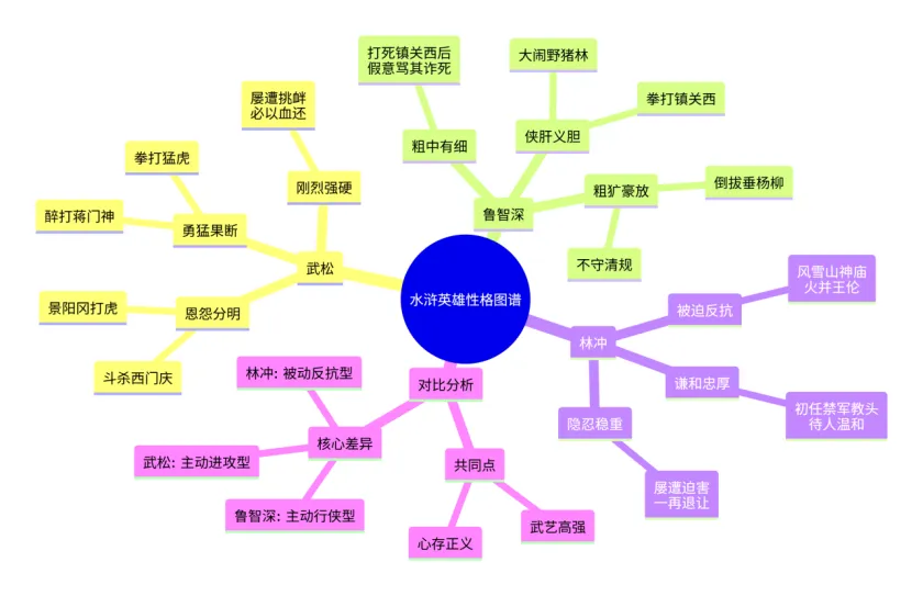 选择2-3位英雄(如武松、鲁智深、林冲),使用思维导图等工具,从“勇猛”、“机智”、“义气”、“鲁莽”、“隐忍”等角度分析其性格的异同,深入理解“同而不同”的塑造手法。