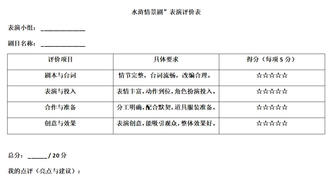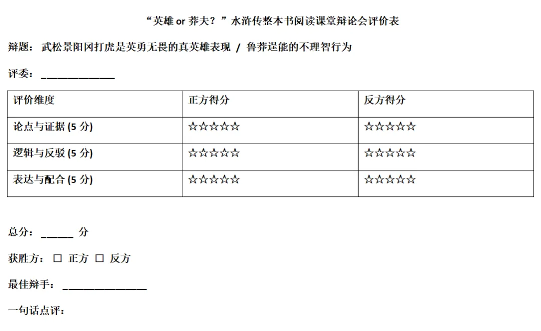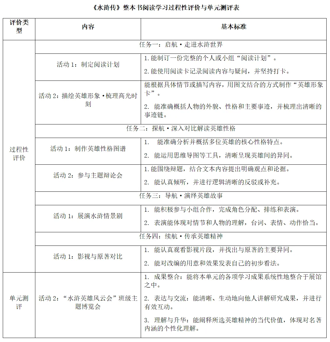 评价贯穿始终。我为每一个任务和活动都设计了明确的过程性评价标准,而盛大的“水浒英雄风云会”本身就是最终的、表现性的单元测评,全面检验学生的阅读成效和综合素养。