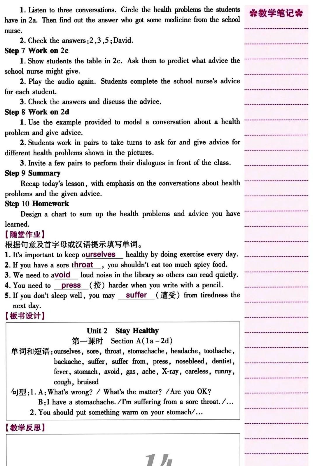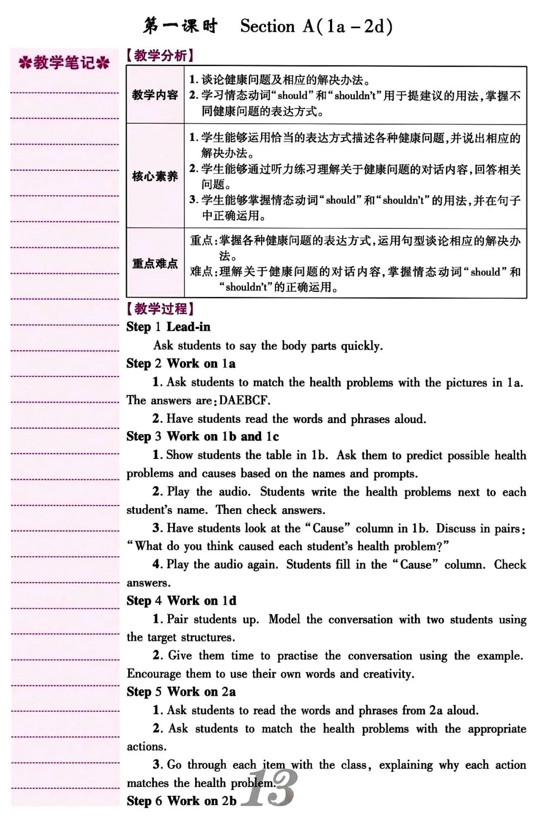 (1)听力任务有效训练了学生捕捉关键信息的能力。(2)对话练习环节通过角色扮演,帮助学生掌握谈论健康问题及相应的解决办法。部分学生能灵活运用Youshould/shouldn't...的句型,但少数学生仍需强化。学生普遍对谈论健康问题及相应的解决办法的话题表现出较高参与度,尤其在讨论“自己的健康问题及相应的解决办法”时,能结合生活经验积极表达。(3)听力任务中,约80%的学生能准确完成匹配,但个别学生对“thecauseofeachstudent'shealthproblems”等问题理解较慢,需训练听力技巧(如抓关键词)。