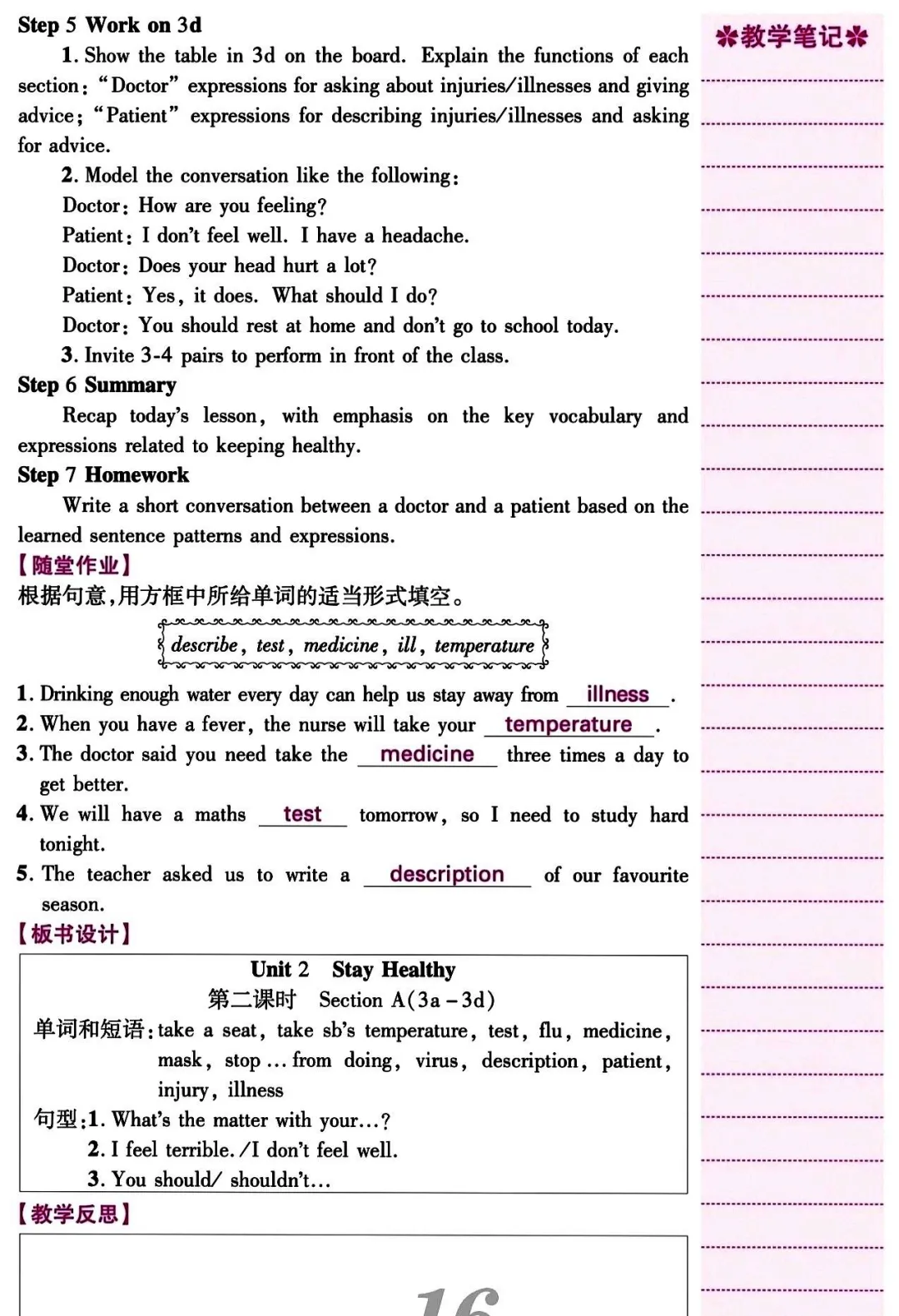 本次课以“医生与患者的对话”为主题,通过问题回答、听力填表及角色扮演等活动,帮助学生提升英语听说能力与综合语言运用能力。(1)情境贴近生活,激发兴趣:对话内容围绕医生与患者的对话的场景展开,学生能快速联系实际生活,积极参与讨论。(2)任务设计层层递进:从听力填空到兼顾语言输入与思维拓展,满足不同层次学生需求。(3)合作学习促进输出:角色扮演环节中,学生分组设计“医生与患者的对话”的对话,灵活运用“Ifeelterrible.”“I don't feel well."“You should..” “You shouldn't”等句式,来巩固目标语言,培养了团队协作能力。