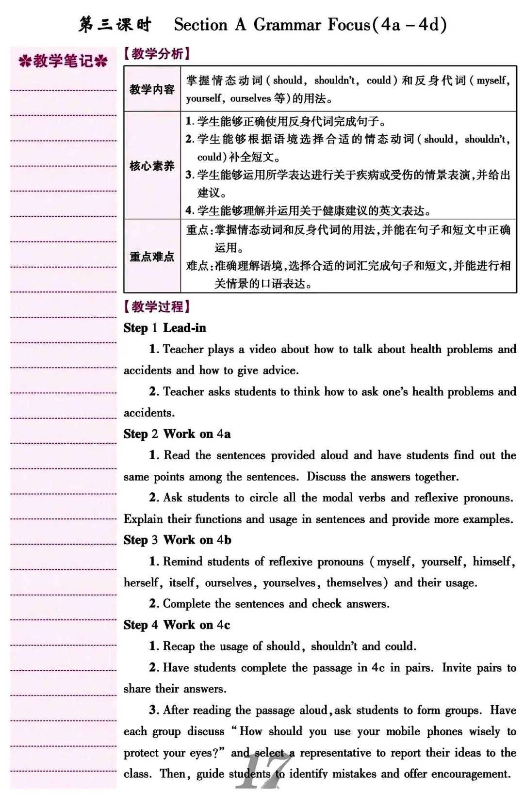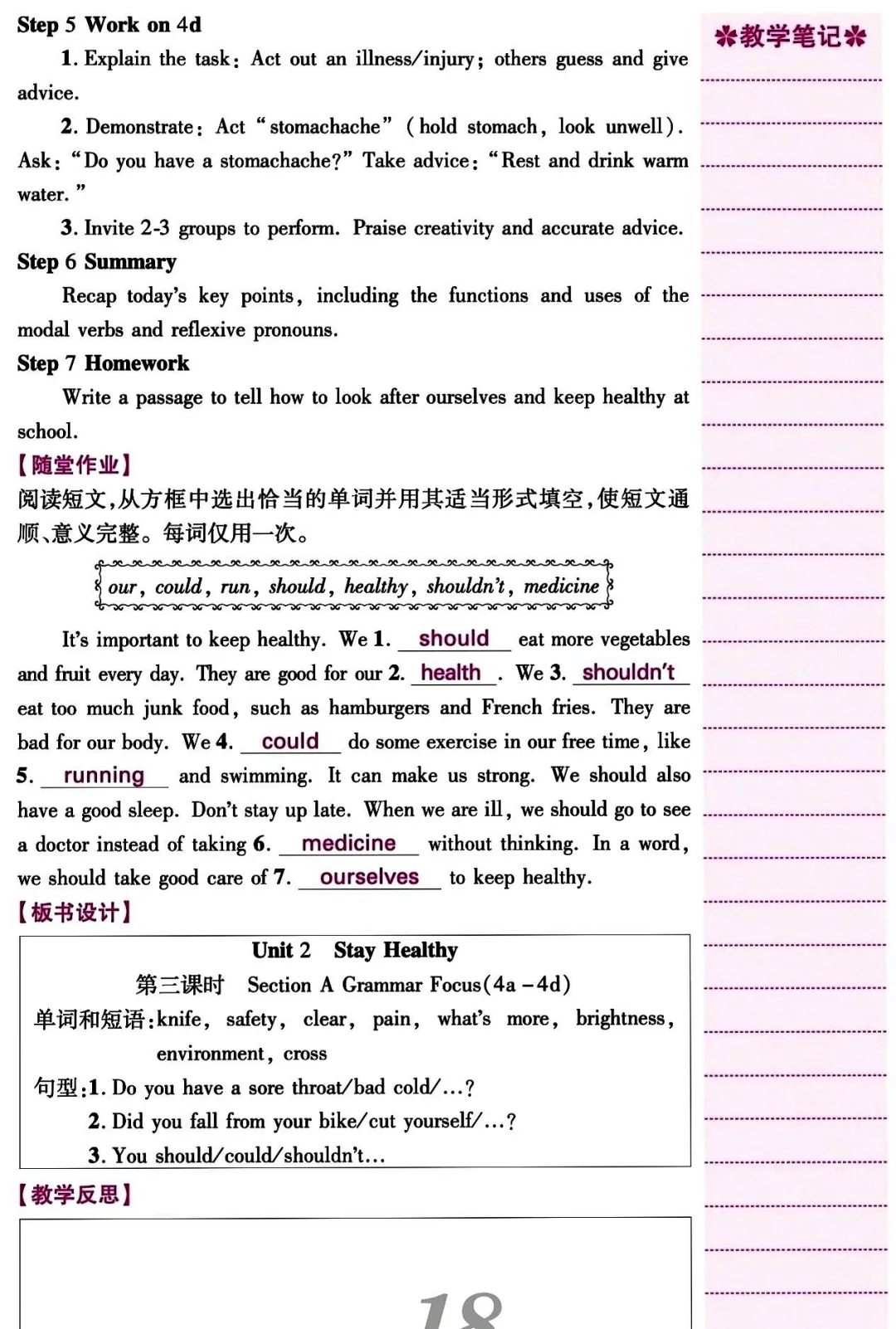 本节课通过结构化的语法对比与情境化练习,有效帮助学生掌握了情态动词“should”“shouldn't”“could”和反身代词的用法的核心用法,但需进一步强化语用指导,使语言学习更具深度与实用性。