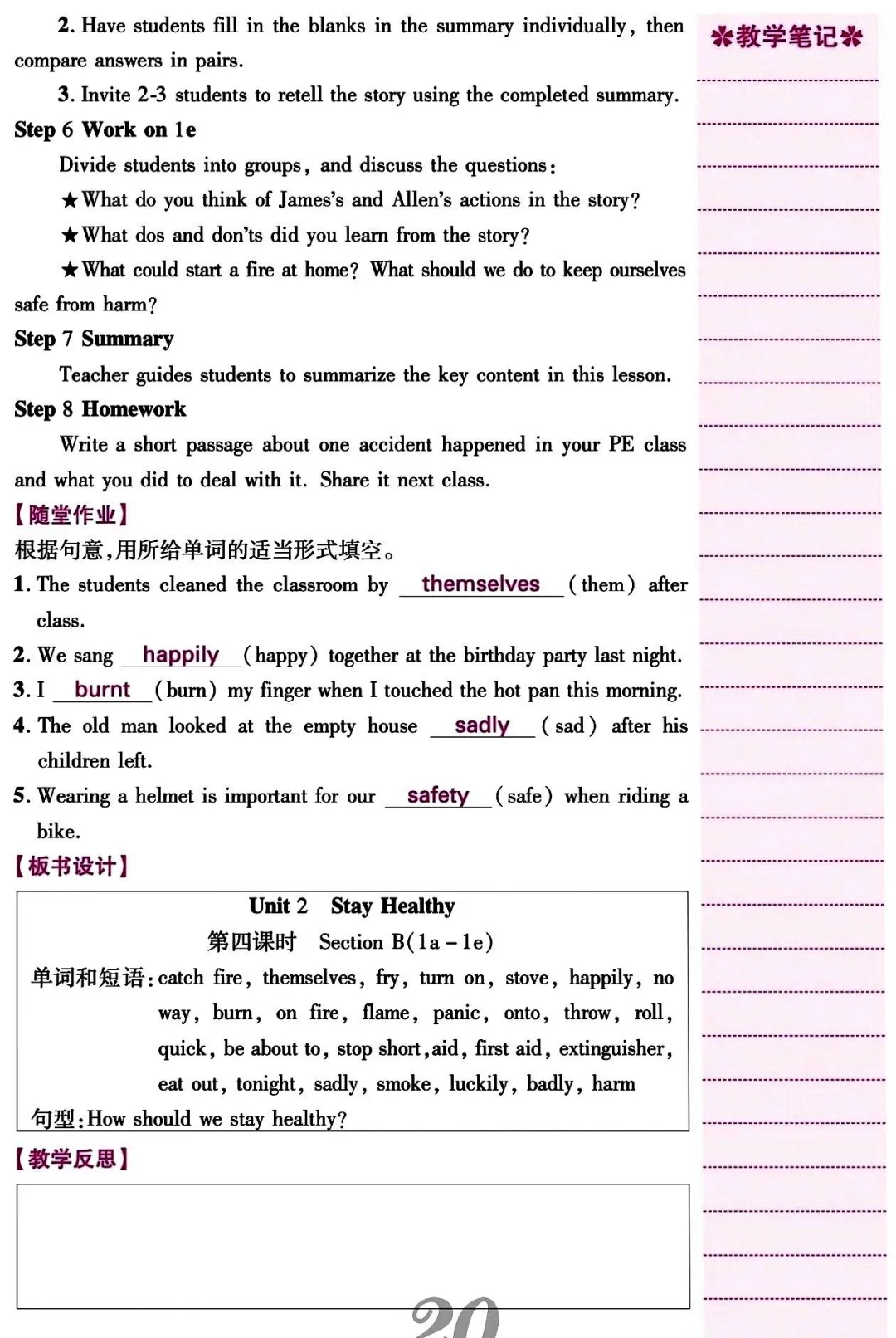 本次课整合词汇与项目式学习,围绕“事故”主题开展多维度教学,现就教学效果进行总结反思。(1)词汇教学:通过添加后缀拓展,学生能自主学习新单词,词汇运用灵活度提升明显。(2)任务教学:在项目式学习中,小组合作设计的“健康小册子”,要求学生要有健康意识。