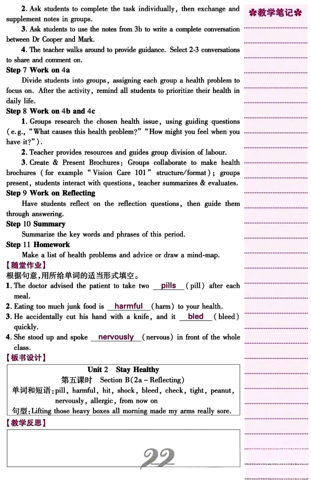改进措施:(1)词汇巩固:通过词汇辨析的方法或短语的固定结构,让学生记牢。(2)优化调查互动:让学生扮演各种角色在调查活动中体会本单元与“健康”有关的重点短语和句型,以提高学生的兴趣。