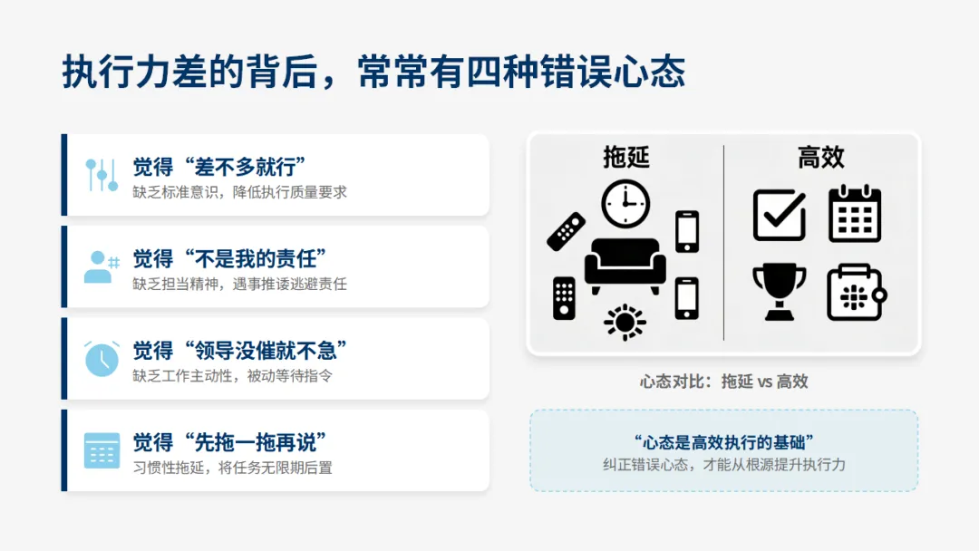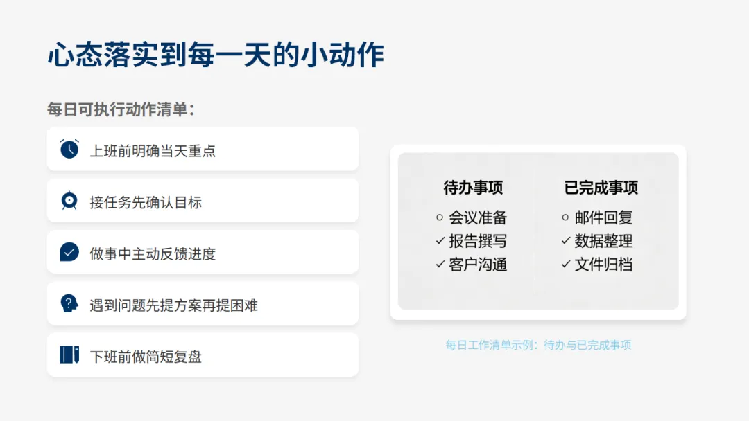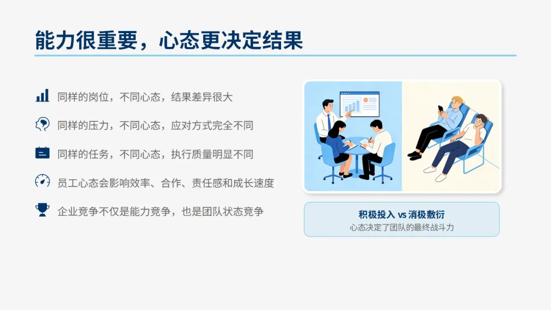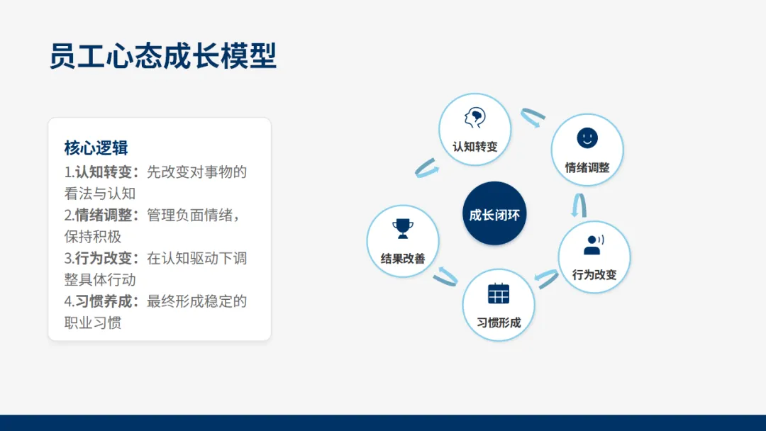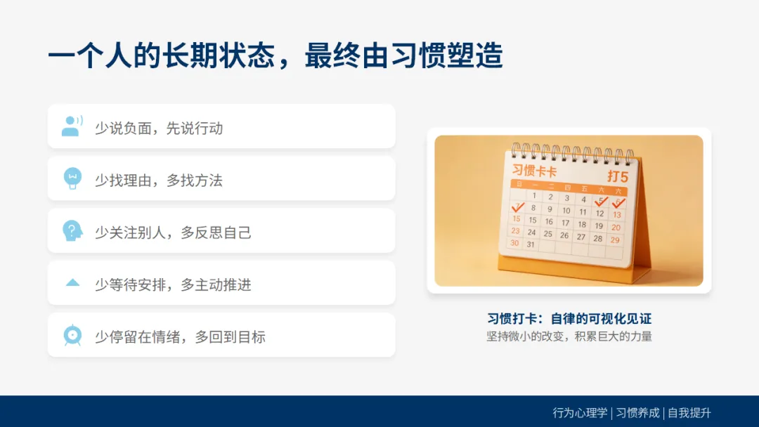 重复的行动模式会固化为习惯。总是主动解决问题的员工,会形成"问题解决者"的身份认同;总是抱怨逃避的员工,会形成"受害者"的心理定位。习惯一旦形成,就会自动运转,不再需要意志力消耗。