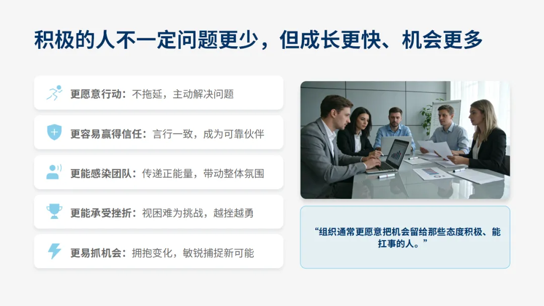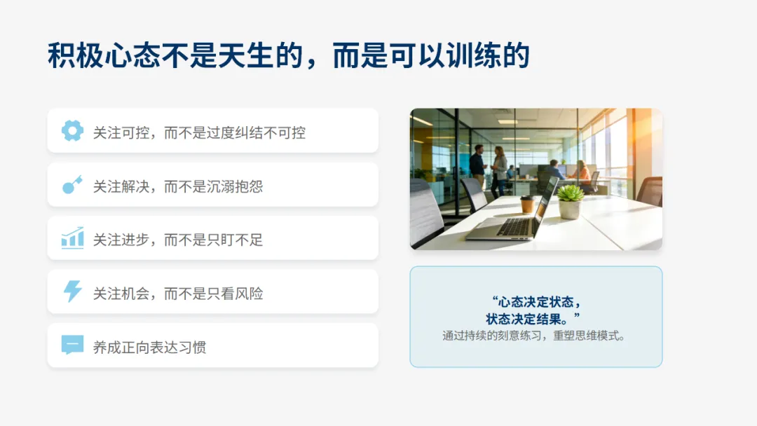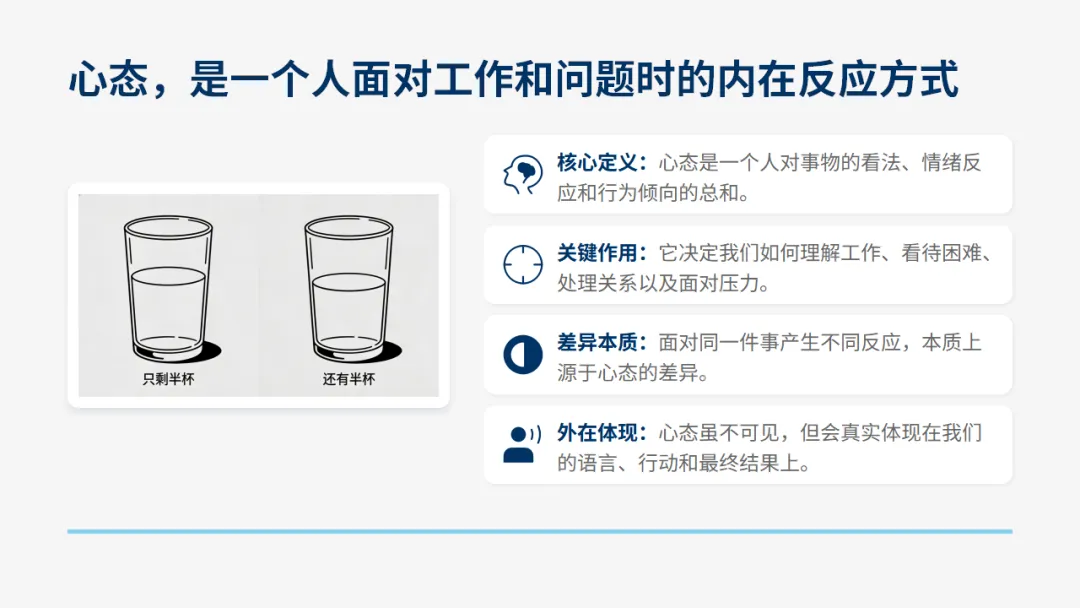 同样半杯水,积极心态看到"还有半杯",消极心态看到"只剩半杯"。在职场中,这种认知差异无处不在。新项目启动,积极心态看到"展示能力的机会",消极心态看到"又多了一堆麻烦事"。