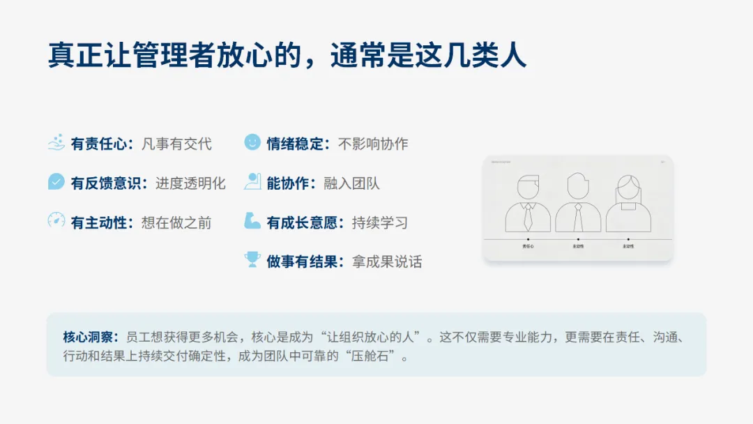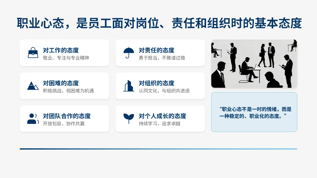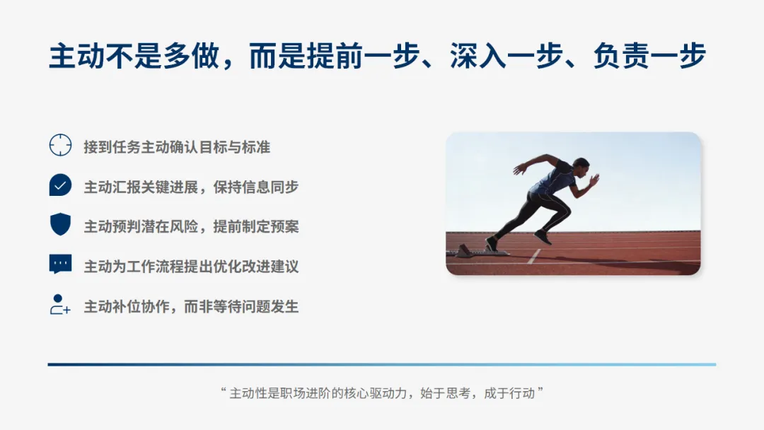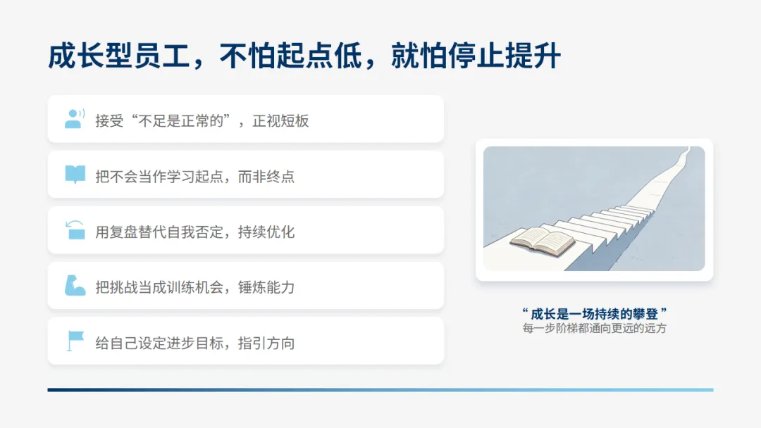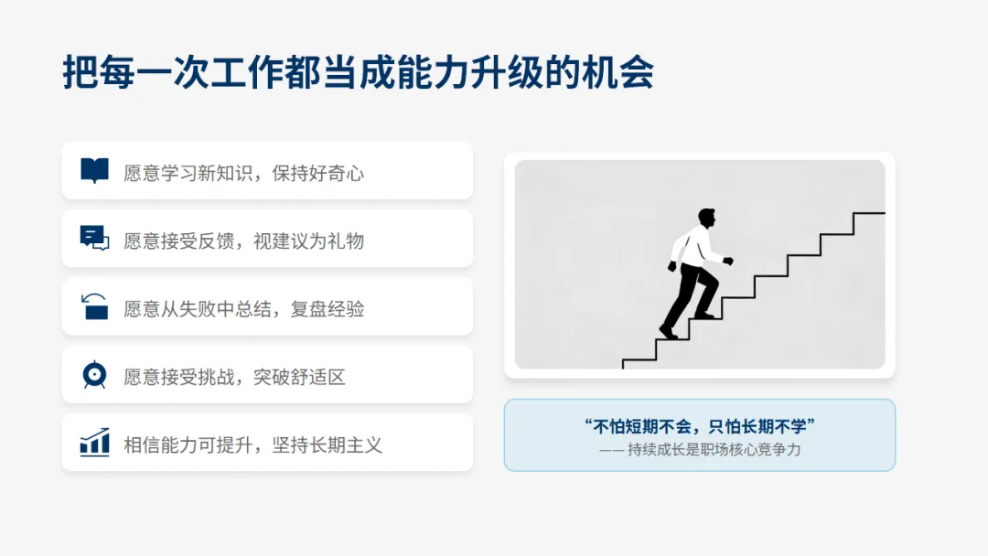 在知识更新周期只有18个月的今天,停止学习就是退步。职业化的员工会主动规划自己的学习路径,把每一个工作任务都视为能力升级的机会。