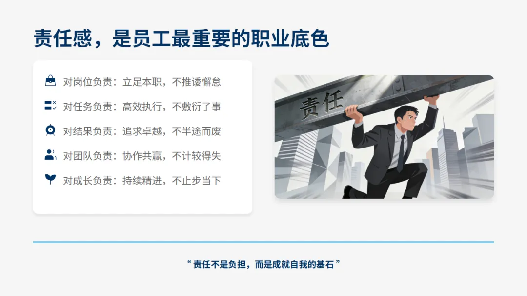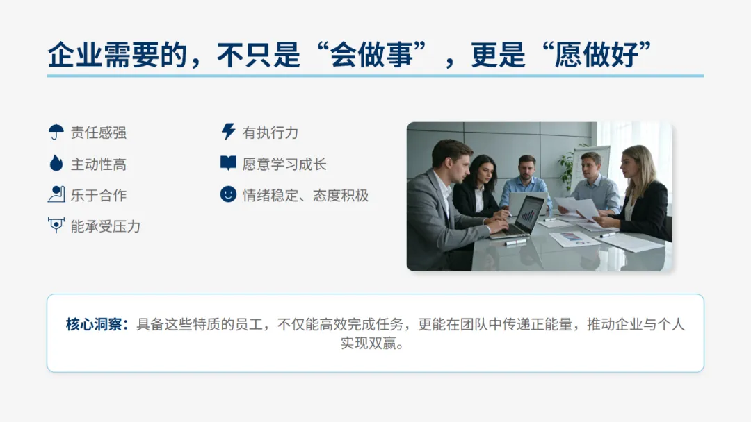 这意味着你不仅仅是在"打工换钱",而是在通过工作创造价值。敬业的人会思考:"如果这是我自己的公司,我会怎么做?"专注的人能在干扰环境中保持心流状态,专业精神体现在对行业标准和最佳实践的尊重与追求。
