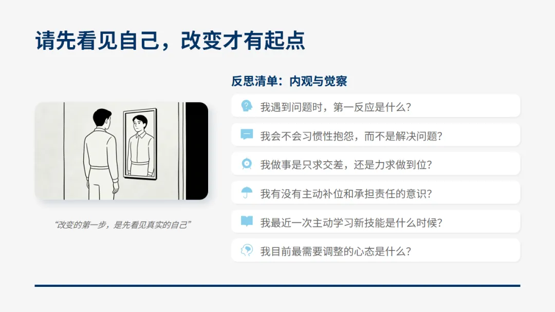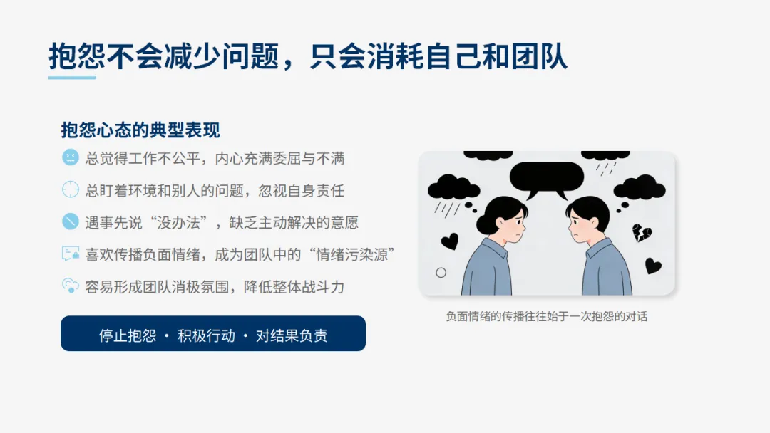 抱怨不会减少问题,只会消耗你和团队的能量。停止抱怨,积极行动,对结果负责,这是职业化的起点。