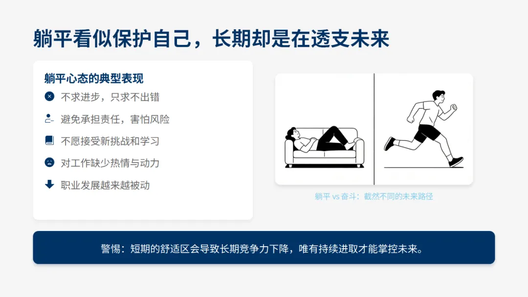 行为经济学发现,人们往往会高估当下的收益,低估未来的成本。应付工作当下省下的力气,未来可能要付出十倍百倍的代价去弥补——可能是错失晋升机会的成本,可能是被迫转换跑道的成本,可能是能力退化后重新学习的成本。