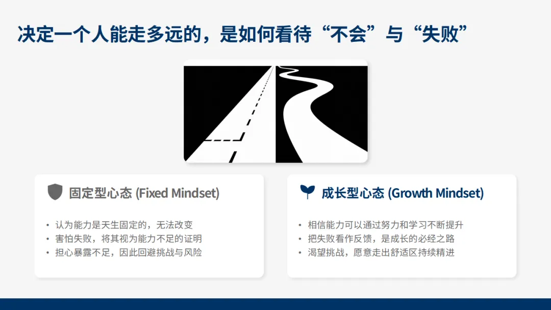 一个心态转变,可能改变你的行动方式;行动方式的改变,可能改变你的技能水平;技能水平的改变,可能改变你的职业轨迹;职业轨迹的改变,可能改变你的人生轨迹。