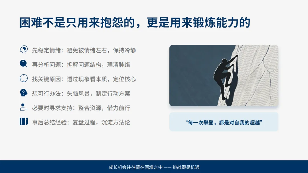 第三,对困难的态度——积极挑战,视困难为机遇。
