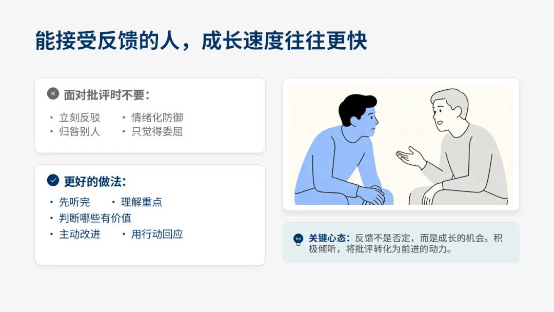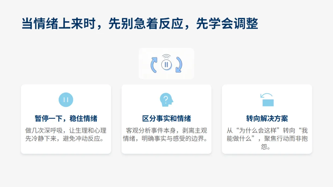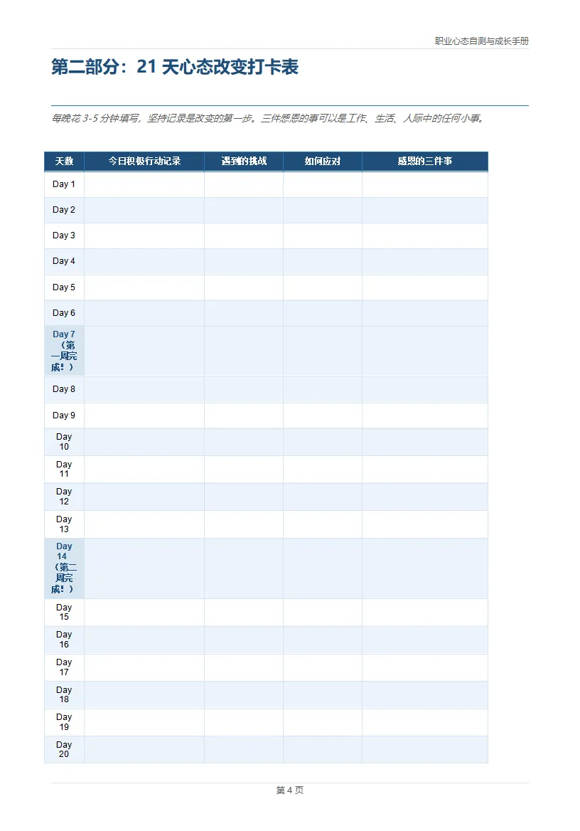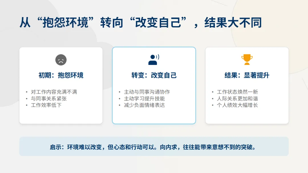 在360度反馈中,同事们给他的评价是:"能力很强,但负能量太重,跟他合作很累。"这次反馈让小李惊醒。他开始实践"21天不抱怨"挑战——戴上一个手环,每次发现自己在抱怨时就换手环,从右手换到左手,重新开始计数。刚开始,他一天要换手环十几次。慢慢地,他学会了把"烦死了,需求又变了"转换成"需求变更说明市场变化快,我需要建立更灵活的迭代机制"。半年后,他成了部门里最能驾驭不确定性的人,被提拔为高级产品经理。