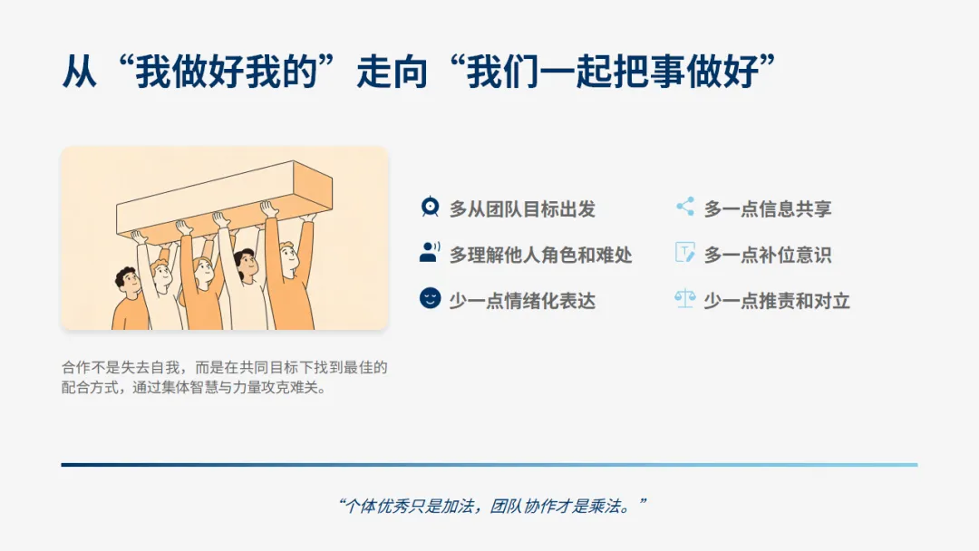 现代职场几乎没有完全独立的工作,每个人都是系统中的节点。职业心态要求我们既要守土有责(做好本职工作),又要具备系统思维(理解上下游的需求和难处)。