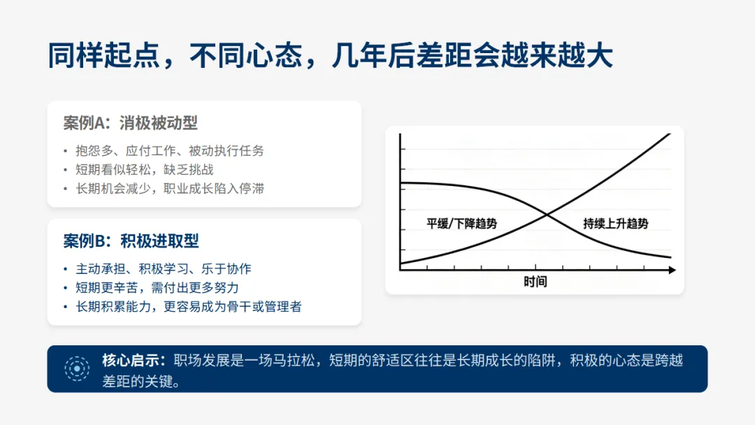 职业发展本质上是"能力复利"的过程。你今天做的每一件事,都是在为明天的自己积累品牌资产。当你应付工作时,你错过了提升能力的机会,错过了展示潜力的机会,错过了建立信任的机会。这些机会看似无形,但它们决定了三年后你是成为专家还是被淘汰。
