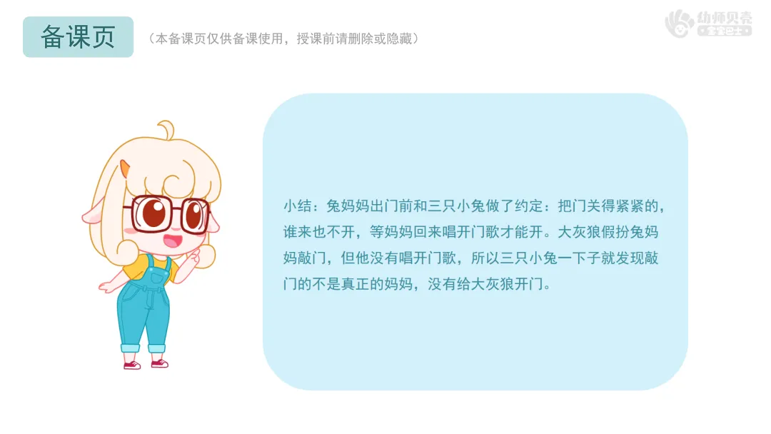 小结:兔妈妈出门前和三只小兔做了约定:把门关得紧紧的,谁来也不开,等妈妈回来唱开门歌才能开。大灰狼假扮兔妈妈敲门,但他没有唱开门歌,所以三只小兔一下子就发现敲门的不是真正的妈妈,没有给大灰狼开门。