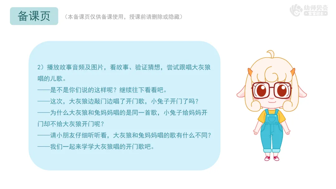 2)播放故事音频及图片,看故事、验证猜想,尝试跟唱大灰狼唱的儿歌。