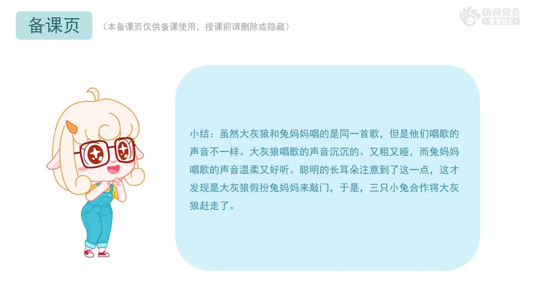 小结:原来,大灰狼并没有离开,他躲在大树后面,偷偷地把兔妈妈的歌给学会了。