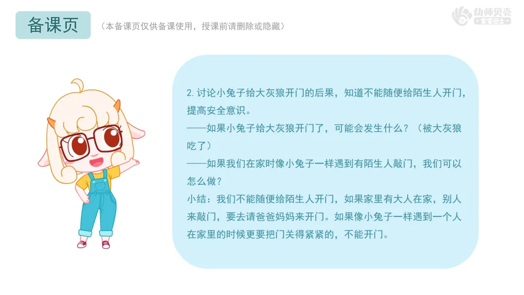2.讨论小兔子给大灰狼开门的后果,知道不能随便给陌生人开门,提高安全意识。