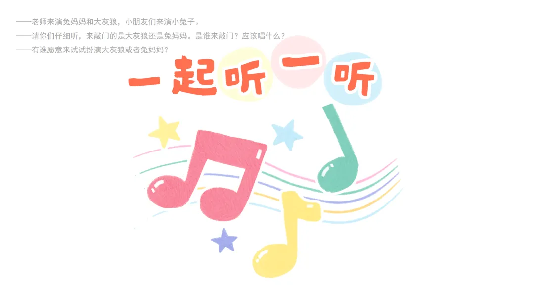 ——老师来演兔妈妈和大灰狼,小朋友们来演小兔子,请你们仔细听,来敲门的是大灰狼还是兔妈妈。