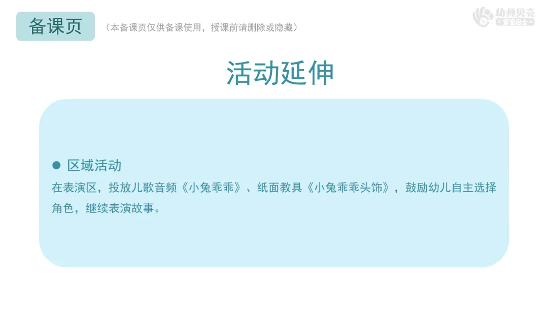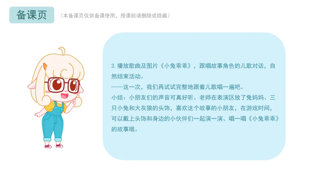 小结:小朋友们的声音可真好听。老师在表演区放了兔妈妈、三只小兔和大灰狼的头饰,喜欢这个故事的小朋友,在游戏时间,可以戴上头饰和身边的小伙伴们一起演一演、唱一唱《小兔乖乖》的故事哦。