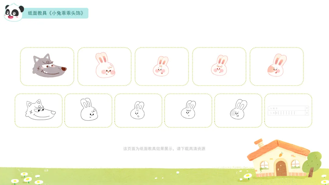 在表演区,投放儿歌音频《小兔乖乖》、纸面教具《小兔乖乖头饰》,鼓励幼儿自主选择角色,继续表演故事。