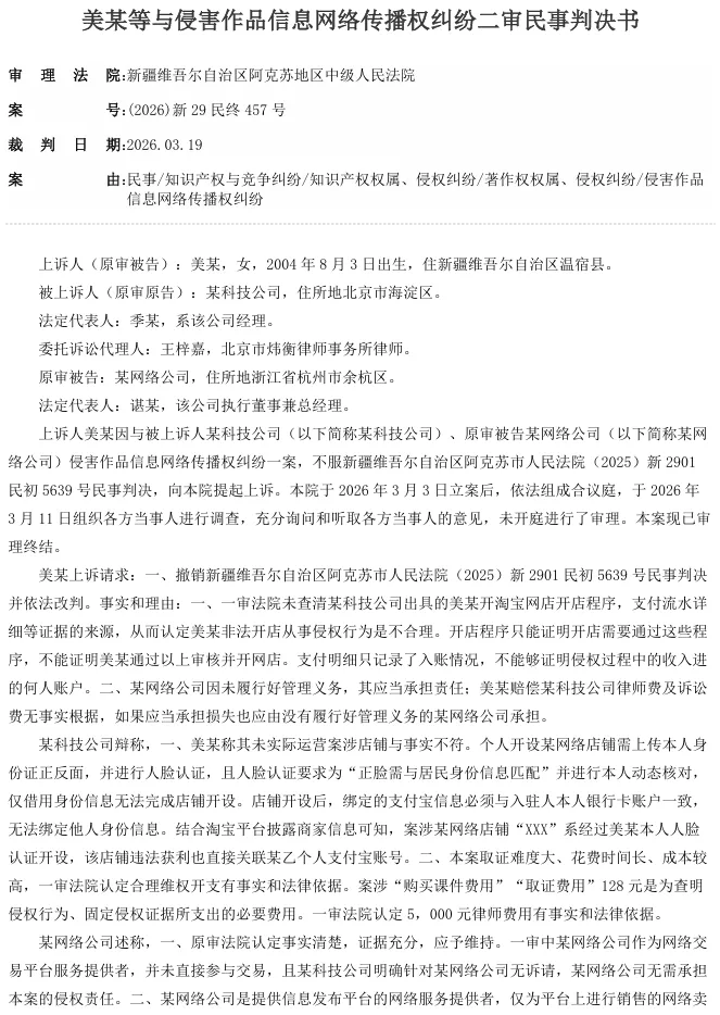2026年3月19日,新疆维吾尔自治区阿克苏地区中级人民法院就侵害作品信息网络传播权纠纷一案作出终审判决:美某未经许可,在其淘宝店铺中低价销售某科技公司享有著作权的远程辅导课件,并通过百度网盘传播,构成侵害作品信息网络传播权。