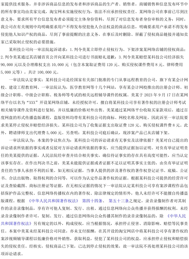 上诉人美某(原审被告)系淘宝店铺“XXX”的开店人。被上诉人某科技公司(原审原告)为一家远程教育公司,享有注册会计师考试辅导课件等作品的著作权。美某未经许可,在其店铺中低价销售上述课件,并通过百度网盘传播盗版资料,某科技公司遂诉至法院,要求美某停止侵权、赔礼道歉、赔偿经济损失及合理维权费用共计10万元。